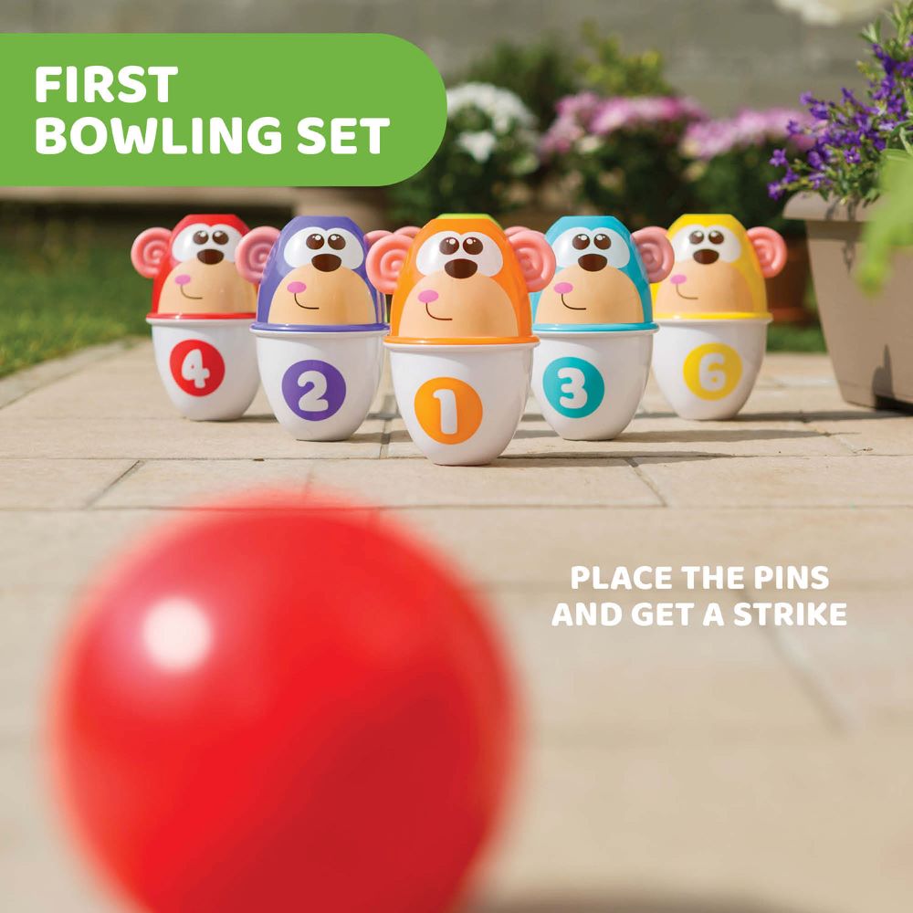 Chicco Apaspila 2in1 Keiluspil með mjúkum bolta Hægt að raða á mismunandi vegu Hver api er mismunandi á litinn og með tölustafi frá 1-6 Örvar sköpunargleði, nákvæmni og samhæfingu.
