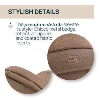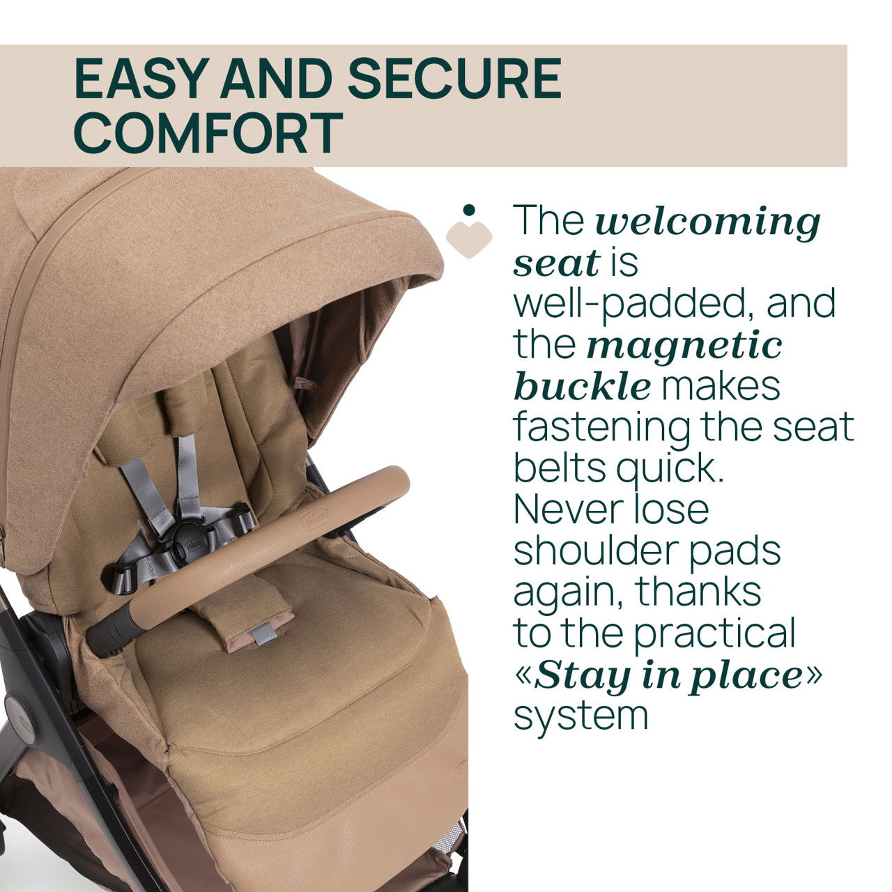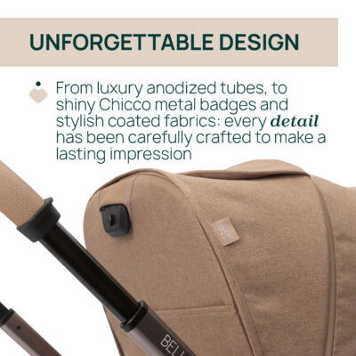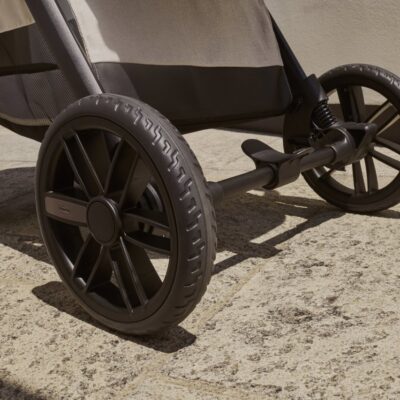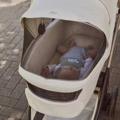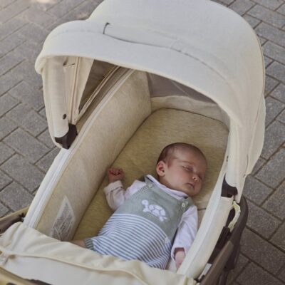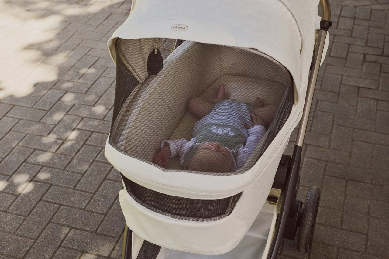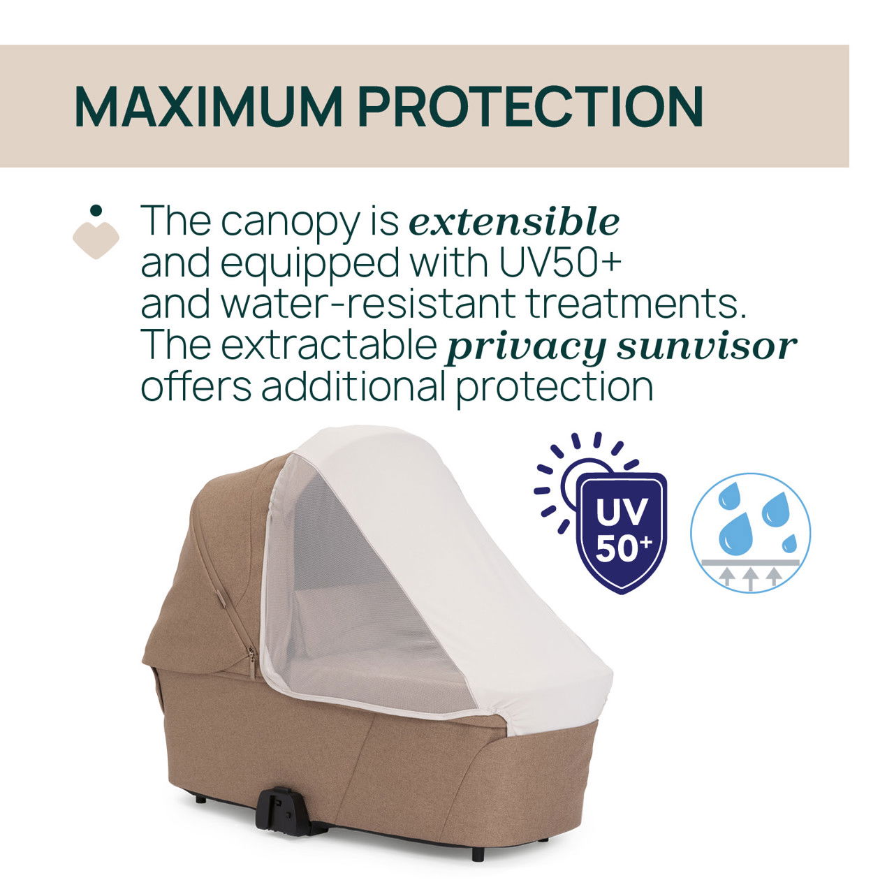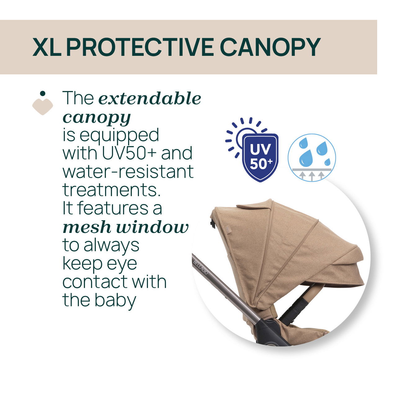 Skermurinn er með UV50+ sólarvörn og vatnsvörn sem ver barnið gegn veðri og vindum. Einnig er gluggi á áklæðinu sem hægt er að opna og loka til að fylgjast með barninu eða til að auka loftflæði.
