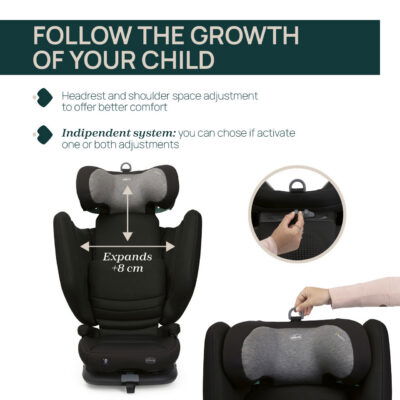 4 stillingar á breidd sem veita allt að 8 cm aukið pláss í axlarhæð, svo bílstóllinn aðlagast vexti barnsins á þægilegan og öruggan hátt.