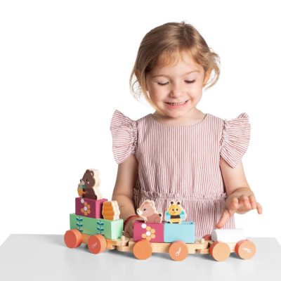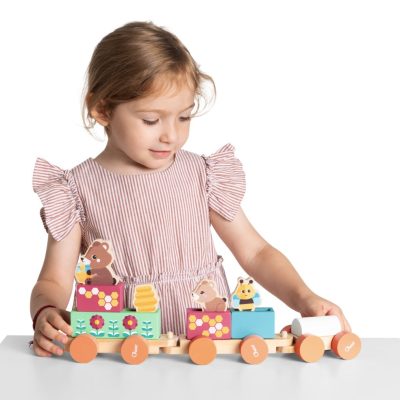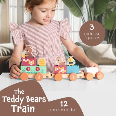 Þessi fallega viðarlest inniheldur 4 skemmtilegar fígúrur – tvö bjarndýr, vinalega býflugu og býflugnabúið hennar
